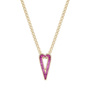 Our slide-on grandsize pink sapphire encrusted heart pendant is handcrafted in 14k gold, with textured sides and set with 33 baguettes.