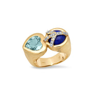 The peace and love ring is crafted in 14K gold and features hand carved stones with a pavé diamond inlay.