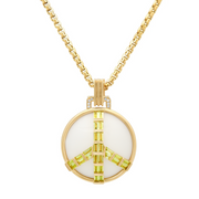 The midsize Peace Necklace is intended to represent your personal journey to attaining soul fulfillment and inner peace. Handcrafted in 14k yellow gold, white onyx, and peridot, this pendant features a pavé diamond bail attachment with a clip-on bail that can be attached to most chains and links.
